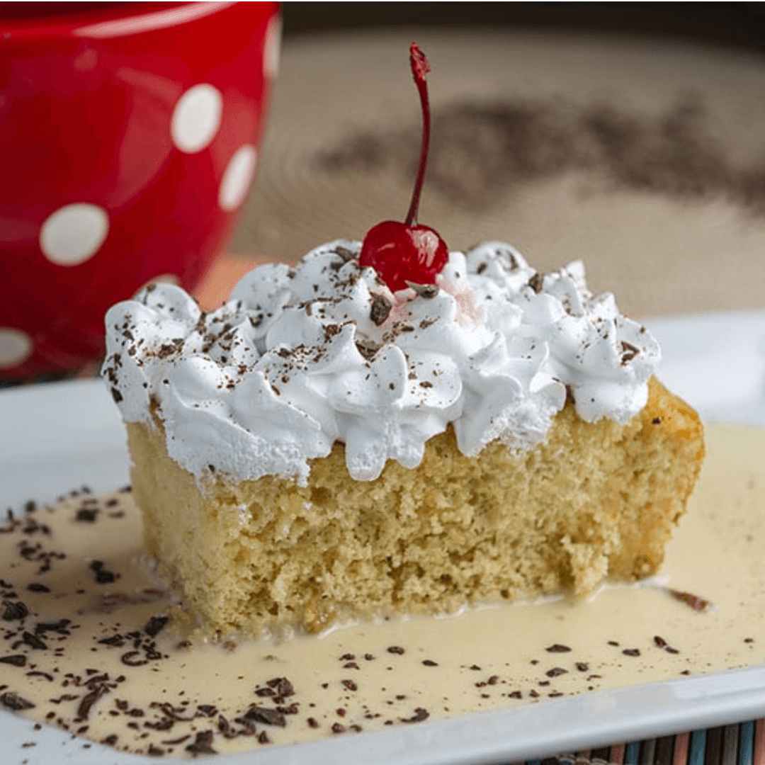 Delicioso bizcocho de vainilla, humedecido con tres leches y tantillí.