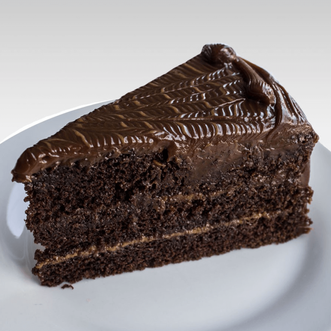 Suave cake de chocolate amargo, humedecido con tres leches y decorado con chocolate de leche